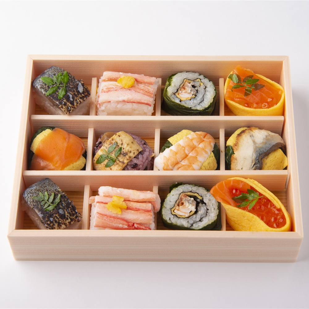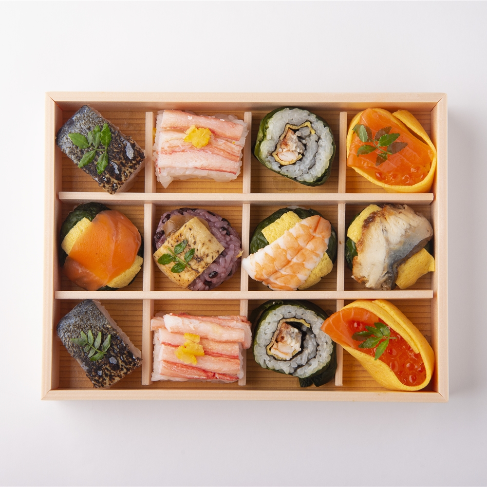 内容:梅酢炙り鯖棒寿司、古代巻、紅ずわいがに棒寿司、わさび巻、鮭いくら錦糸巻×各2個、手鞠わさび葉寿し 鮭、手鞠わさび葉寿し 鯖、手鞠わさび葉寿し 海老、手鞠わさび葉寿し 鰻、古代あなら寿し×各1個