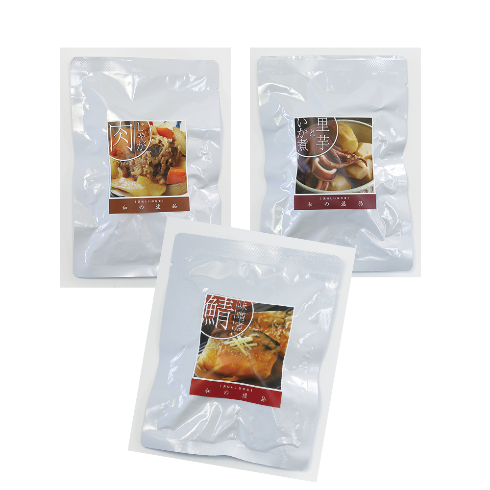 内容:肉じゃが(200g)×2、里芋といか煮(200g)×1、鯖味噌煮(120g)×2
