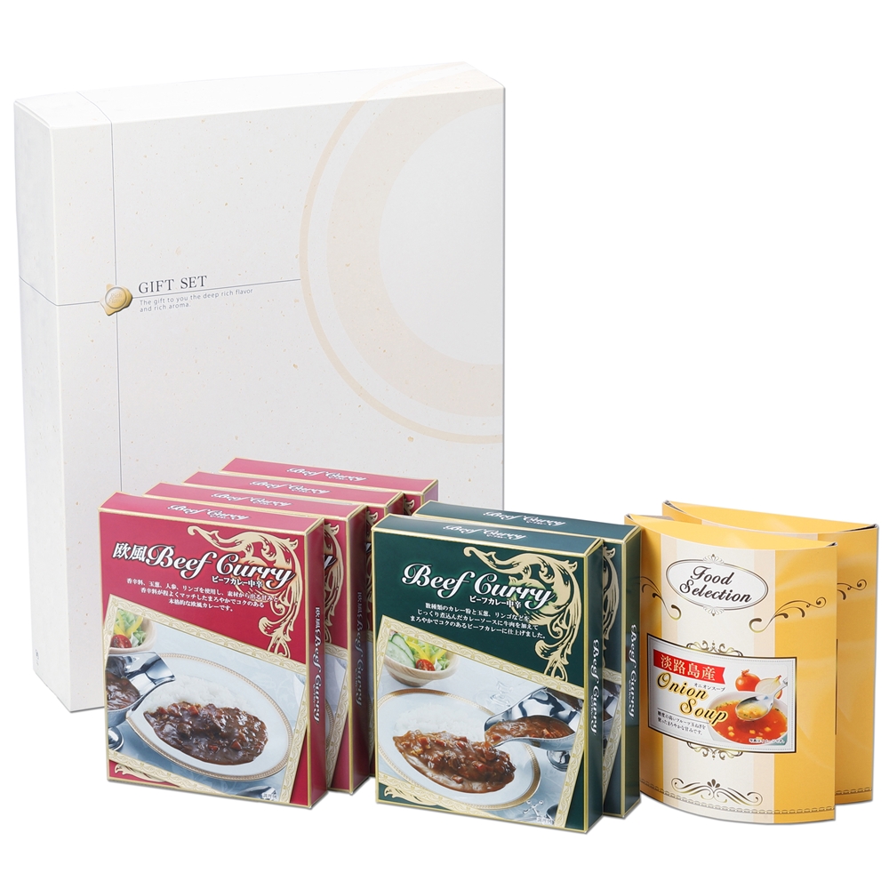 内容:ビーフカレーレギュラー(中辛)150g×2、ビーフカレー欧風(中辛)150g×4、淡路島産フルーツたまねぎのスープ(6.2g×4)×2