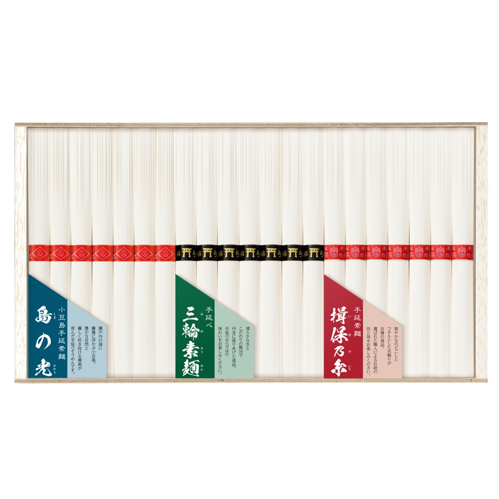 内容:手延素麺「揖保乃糸」50g×14束、手延べ「三輪素麺」50g×14束、小豆島手延素麺「島の光」50g×14束 (木箱入り)