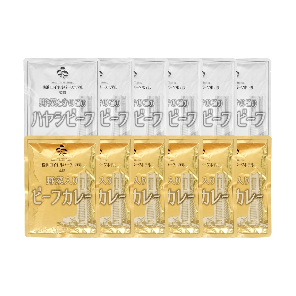 内容:野菜入りビーフカレー200g×6、野菜ときのこのハヤシビーフ180g×6