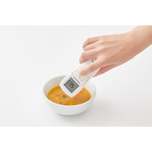 手軽にはかれて、結果が見やすい体温計。測定時間約1秒、おでこで計測する非接触体温計です。カラダに触れずに測定できます。バックライト付き大型表示で暗くても見やすく、体温の測定結果が38℃以上の場合は光と音とマークでお知らせします。モード切替で温度測定モードを選択するとミルクやスープなどの温度(表面温度)も測定できます。