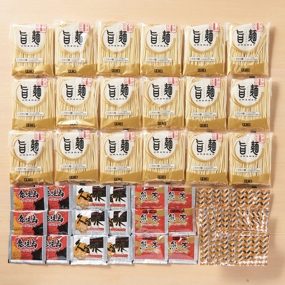 内容:麺80g×18、久留米スープ38g・鹿児島スープ35g・熊本スープ40g×各6、ラーメンふりかけ3g×18