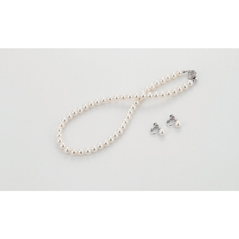 商品材料:ネックレス/玉部分:人工パール(貝パール)、留め具:真鍮(ロジウムメッキ)、イヤリング:人工パール(貝パール)・真鍮(ロジウムメッキ)