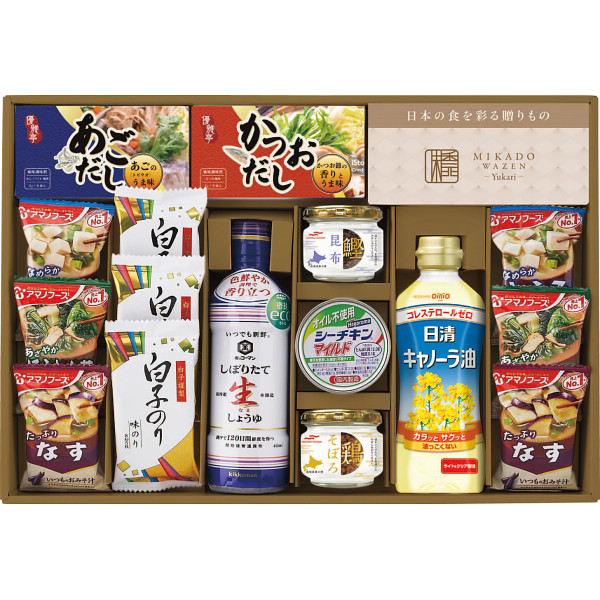 内容:キッコーマンいつでも新鮮しぼりたて生しょうゆ450ml、白子のり味のり(8切5枚)×3、マルハニチロ鰹昆布45g、マルハニチロ鶏そぼろ45g、日清キャノーラ油350g、オイル不使用シーチキンマイルド70g、メイワかつおだし(4g×6)、メイワあごだし(4g×6)、アマノフーズフリーズドライいつものおみそ汁(なす・とうふ・ほうれん草×各2)