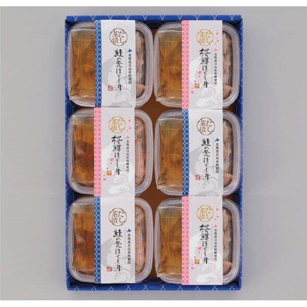 内容:秋鮭のだし茶漬け60g(ほぐし身40g、だしつゆ20g)×3、桜鱒のだし茶漬け60g(ほぐし身40g、だしつゆ20g)×3