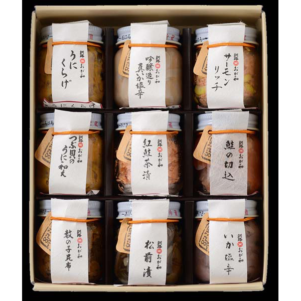 内容:紅鮭茶漬、サーモンリッチ各30g、鮭の切込、つぶ貝のうに和え、うにくらげ、吟醸造り真いか塩辛、いかの塩辛 各45g、特撰松前漬、数の子昆布 各40g