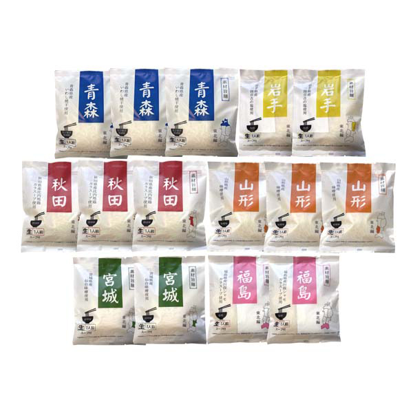 内容:青森魚介豚骨醤油味(めん120g、スープ46g)×3、秋田醤油味(めん120g、スープ40g)×3、岩手磯塩味(めん120g、スープ37g)×2、山形味噌味(めん120g、スープ36g)×3、宮城辛味噌味(めん120g×スープ45g)×2、福島鶏塩味(めん120g、スープ39g)×2