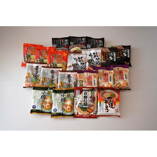 内容:札幌味噌味(麺70g、スープ40g)、米沢醤油味(麺70g、スープ31g)、喜多方醤油味(麺70g、スープ36g)、東京醤油味(麺70g、スープ35g)×各3袋、小樽塩味(麺70g、スープ39g)、秋田比内地鶏醤油味(麺70g、スープ40g)、博多とんこつ味(麺70g、スープ32g)×各2袋、京都醤油味(麺70g、スープ35g)、尾道醤油味(麺70g、スープ40.5g)×各1袋
