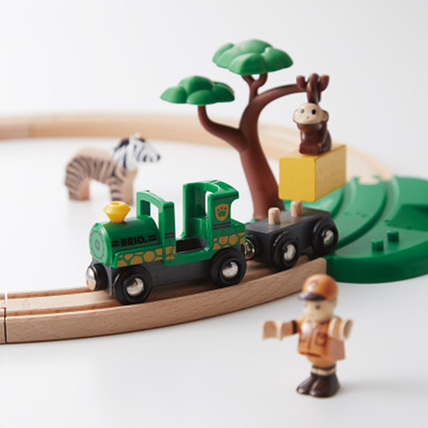 サファリレールでサバンナを冒険しましょう。おさるさんがワゴンから食べ物を取ろうとしています。サファリワゴンと機関車がセットになっています。