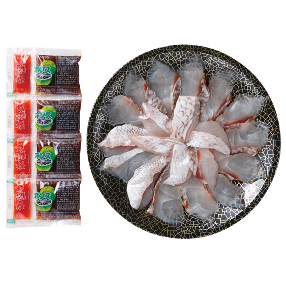内容:真鯛しゃぶしゃぶ用切身200g(22cm皿盛り)、ぽん酢もみじおろし×4