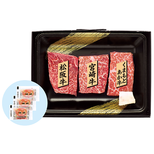 内容:松阪牛もも肉・宮崎牛もも肉・くまもとあか牛もも肉 各80g(ヒマラヤ岩塩付)