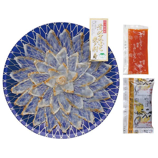 内容:まふぐ炙り刺身80g(ポン酢、モミジオロシ付)