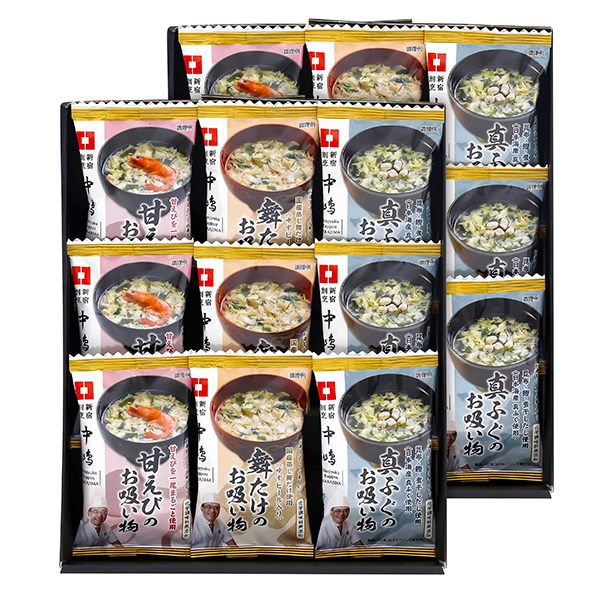 お湯を注ぐだけの手軽さで、長期保存も可能なフリーズドライ製法のお吸い物3種セットです。真ふぐ、甘えび、舞茸のそれぞれの味わいをいかすように昆布やかつおだしなどで味を整えました。