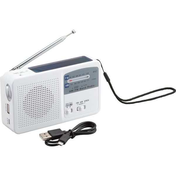 内容:AM/FMラジオ、サイレン、モバイルバッテリー、懐中電灯ソーラー充電、手回し充電、USB充電、単4乾電池3本使用(別売)USBケーブル付