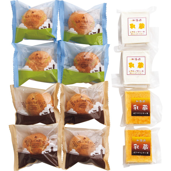 内容:北海道シュー(ミルク)×4、北海道シュー(チョコ)×4、レアチーズケーキ(オレンジピール入り)100g×2、焼きプリンケーキ100g×2