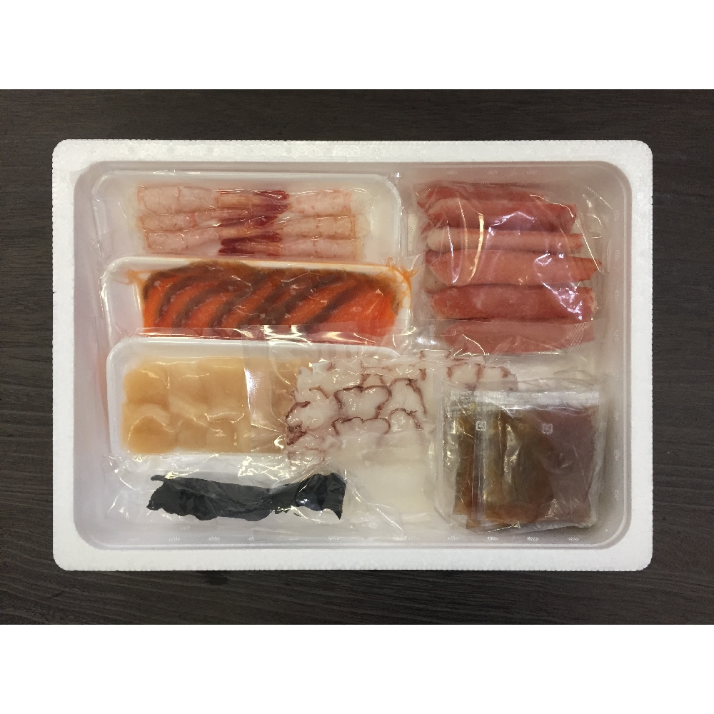 内容:生ずわいがに棒ポーション200g、たこスライス100g、生甘海老(尾付むき海老)×10本、生帆立貝柱スライス100g、トラウトサーモンスライス100g、だし用昆布5g、しゃぶしゃぶ用たれ15g×6※2~3人前