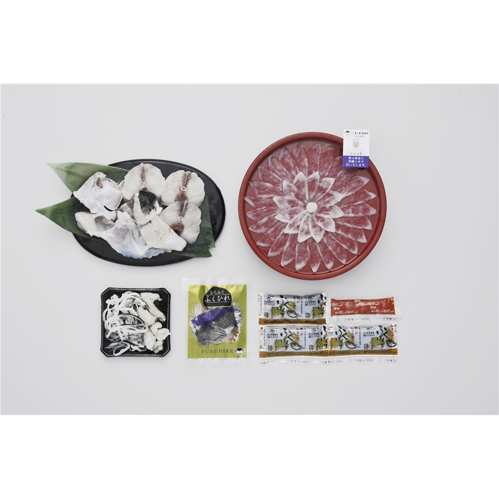 内容:とらふく刺身50g(プラスチック皿21cm盛り)、とらふく皮40g、ふくちり240g(アラ:トラフグ・身:マフグ各120g)、ひれ酒用ヒレ3枚、ポン酢35g×3、モミジオロシ16g