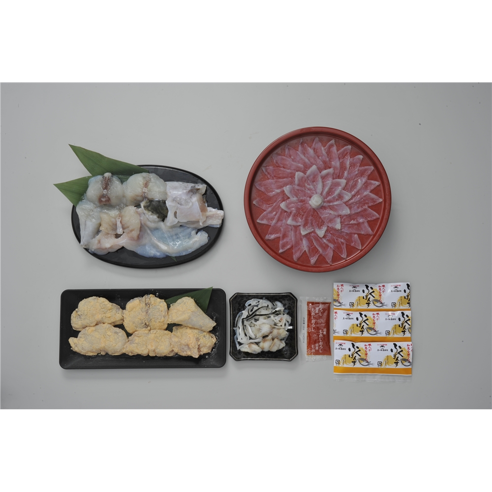 内容:とらふく刺身50g(プラスチック皿21cm)、とらふく皮40g、ふくちり240g(アラ:トラフグ・身:マフグ各120g)、ごまふくから揚げ粉付き200g、ポン酢35g×3、モミジオロシ16g ※刺身皿のデザインは変わる場合がございます。