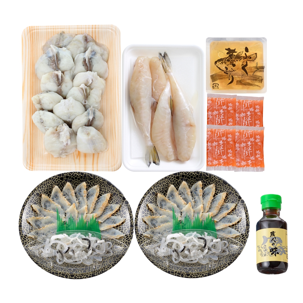 内容:真ふぐたたき刺身(17cm皿)20g×2、とらふぐ皮20g×2、真ふぐちり(切身)300g、ふぐ一夜干し150g、ふぐ煮こごり100g、ふくポン酢100ml、もみじおろし10g×4