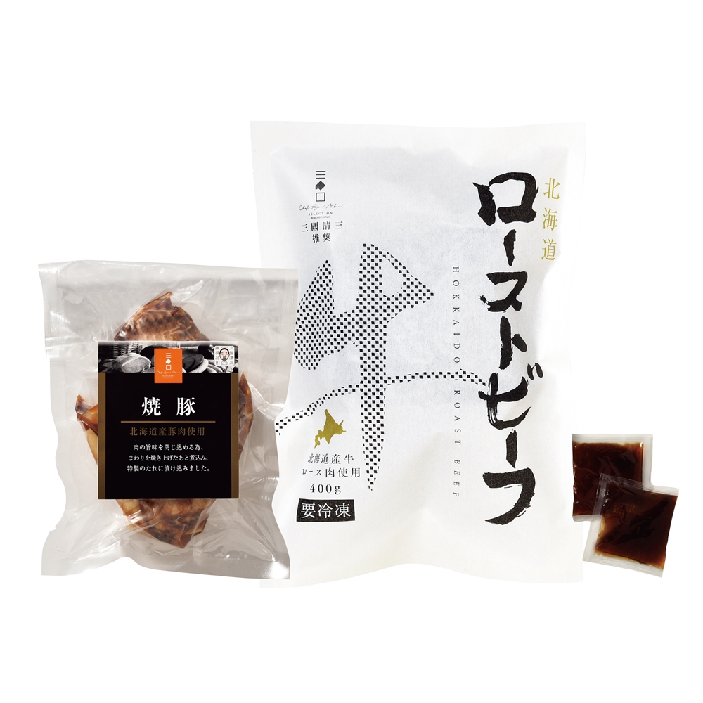 内容:三國推奨北海道産牛ローストビーフ400g、ローストビーフのタレ×2、三國推奨焼豚肉270g