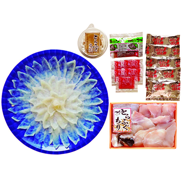 内容:とらふぐ刺身70g×1(25cmプラ皿)、とらふぐちり200g×1、とらふぐ皮刺30g×1、鍋のつゆ20g×1、ぽん酢15g×5、もみじおろし3g×5