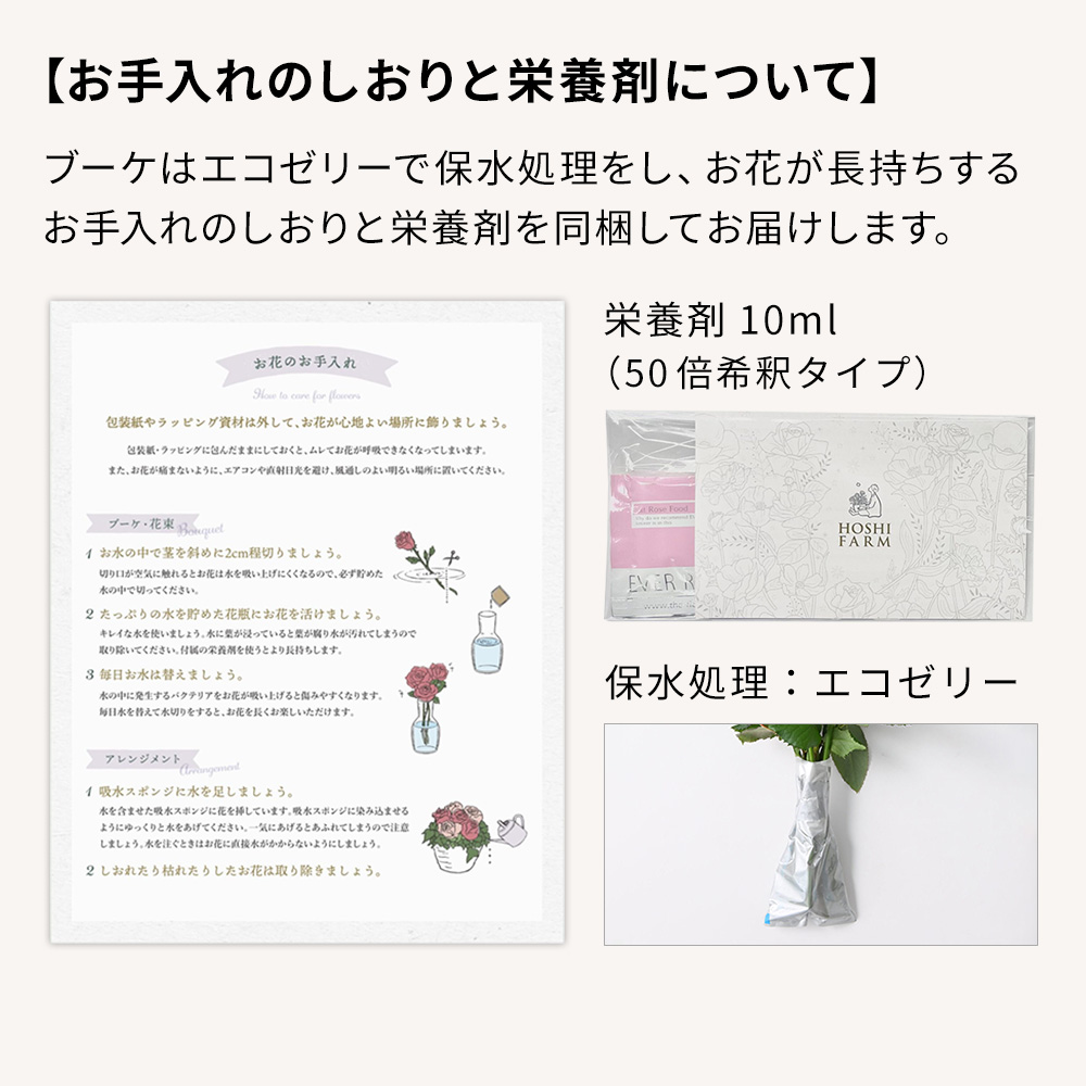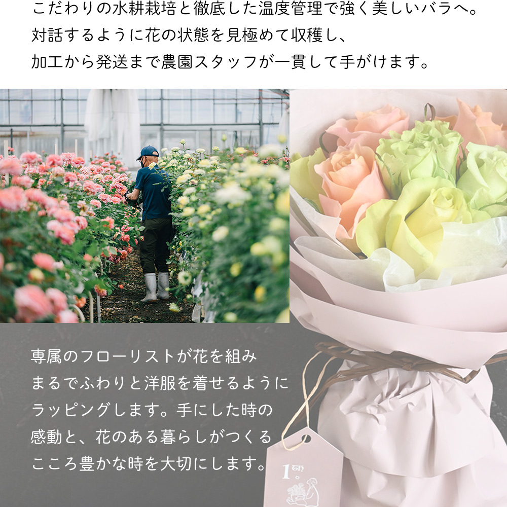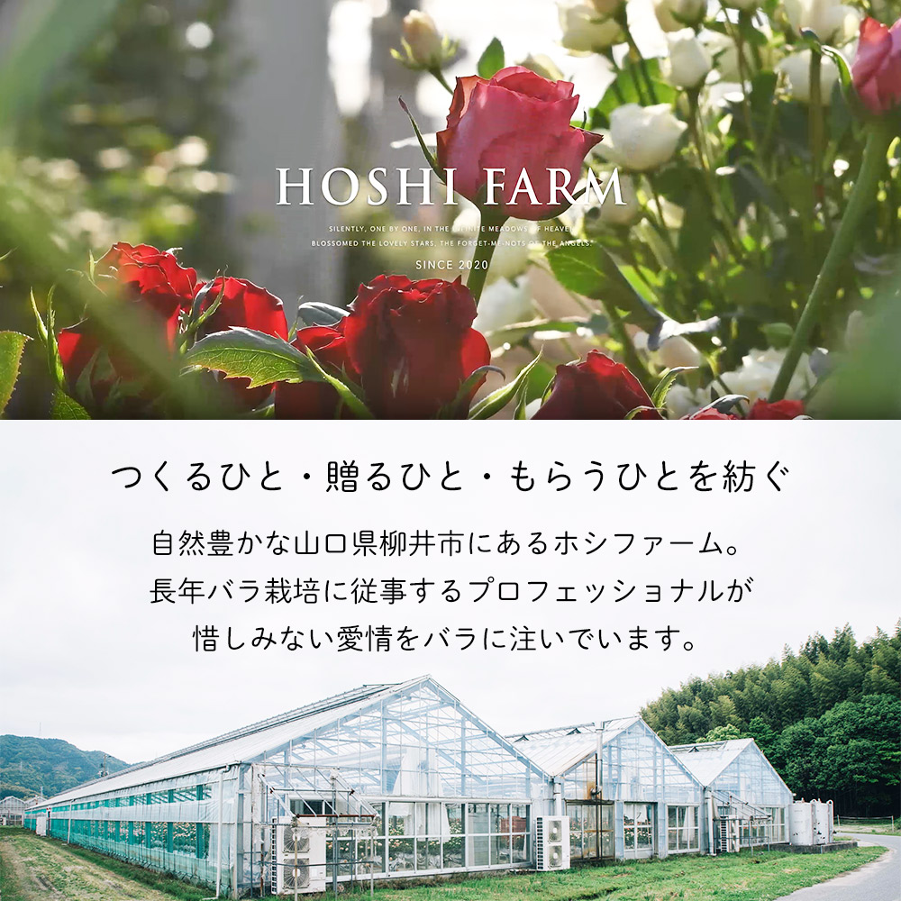 バラ栽培のプロフェッショナルが惜しみない愛情を注ぎ、強く美しいバラへと育てるホシファームのバラ。贈られた花との時間をできるだけ長く楽しんでいただけるよう、花の状態を見極め収穫しています。手元に届いてからふっくらと咲きはじめ、花咲く過程と咲き誇る姿をお楽しみいただけるように、農園から最適なタイミングで直送します。花のある暮らしをお過ごしいただきたい、ご自宅用におすすめのブーケです。