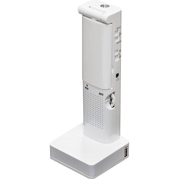 内容:手回し充電(スーパーキャパシタ搭載)、または単3乾電池3本使用(別売)、またはUSB(DC-IN5V)AM/FMラジオ搭載携帯電話、スマートフォン充電可能付属品=充電コード、携帯電話接続プラグ※地域・地形・建築構造・電池残量などの諸条件により電波を受信できない場合があります。
