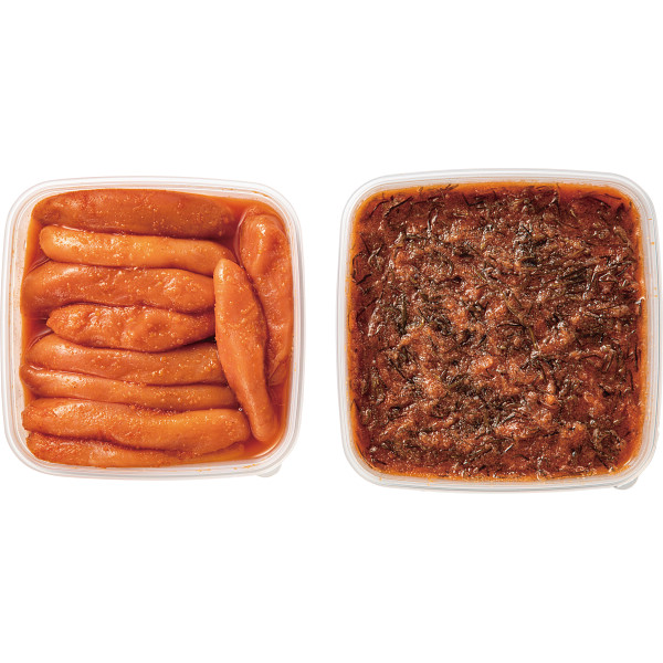 北海道近海で獲れるスケトウダラの卵にこだわり、柚子風味のたれで熟成させた博多辛子明太子と柔らくて美味しい昆布を国産の明太子で和えた昆布明太のセットです。