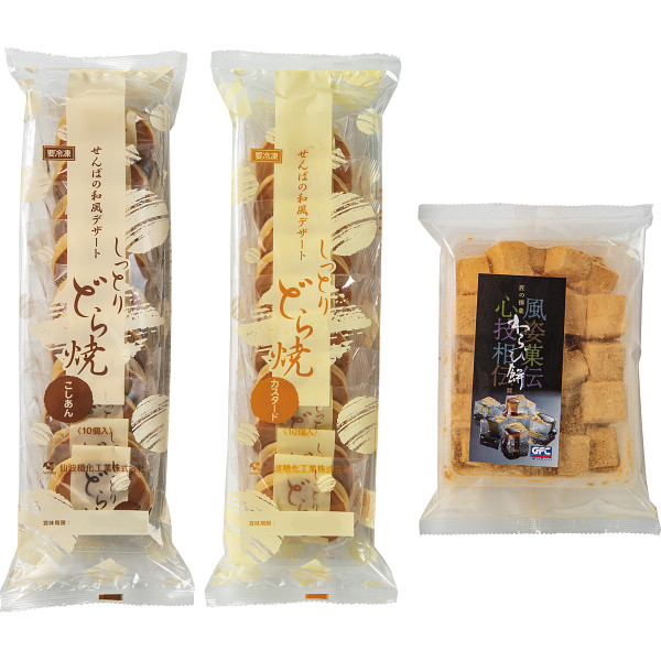 内容:わらび餅(きな粉)500g×1、ミニどら焼きこしあん(40g×10)×1、ミニどら焼きカスタード(40g×10)×1、芋ようかん(40g×6)×2