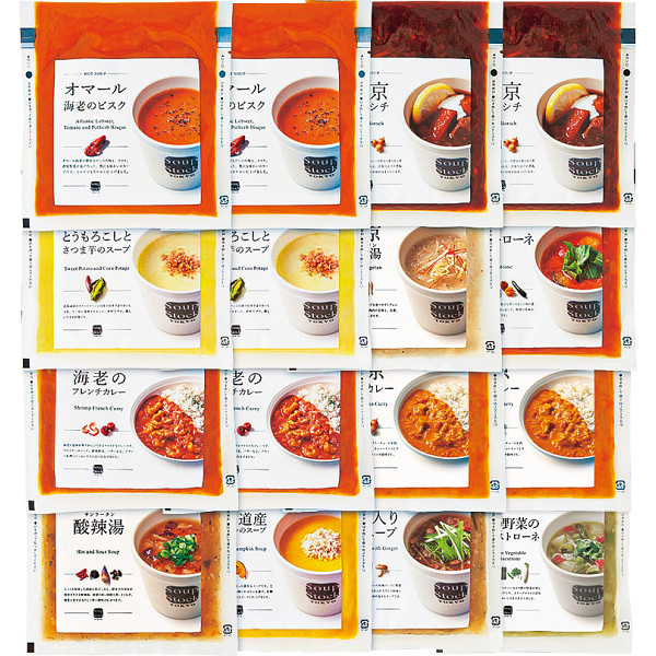内容:オマール海老のビスク・とうもろこしとさつま芋のスープ・東京ボルシチ・海老のフレンチカレー・東京チキンカレー 各180g×2、東京参鶏湯・緑の野菜のミネストローネ・ミネストローネ・生姜入り和風スープ・北海道産かぼちゃのスープ・酸辣湯 各180g×1、出産祝い専用リーフレット、ベビーマンスリーカード