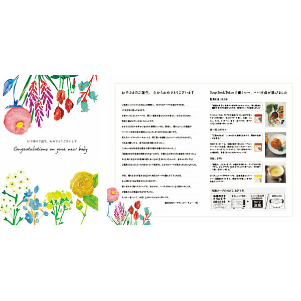 時間のない時でも電子レンジで簡単にお召し上がりいただけるスープストックトーキョーで人気のスープとカレーをセットにしました。お子様の月齢に合わせて、成長を記録できるベビーマンスリーカード付。