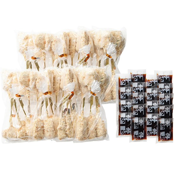 内容:豚ヒレ・えび・鶏チーズ・鶏ねぎ・ちくわチーズ・ほたて・ししとう・アスパラミルフィーユ・豚ロース 各6本(計54本)、串揚げソース20g×18袋