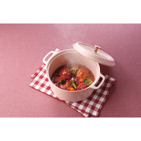 商品材料:本体=アルミニウム(内外面セラミック塗膜加工)、底面=ステンレス、蓋=アルミニウム(内外面セラミック塗膜加工)