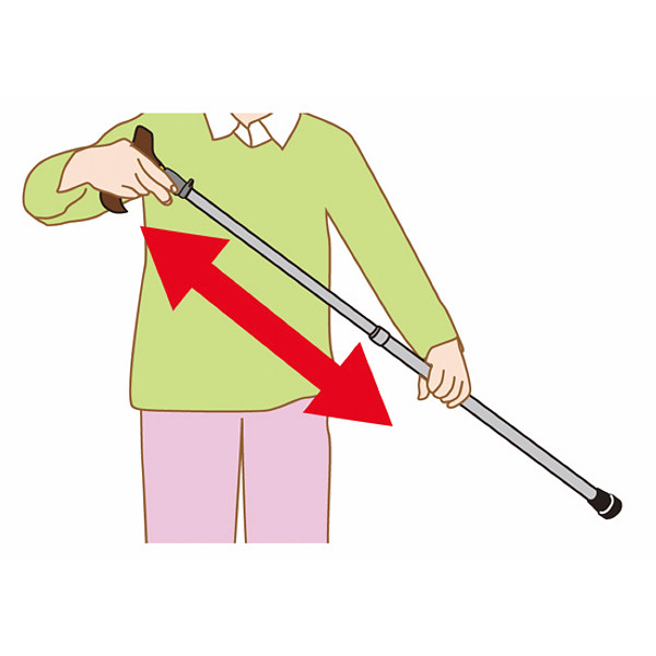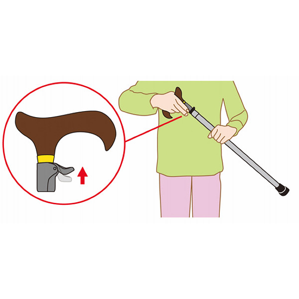 手元のレバーを引くだけで、簡単に杖の長さを調節できるステッキです。階段の登りおりや椅子に腰かけている際など生活空間のなかでも長さが簡単に調節でき、大変便利です。