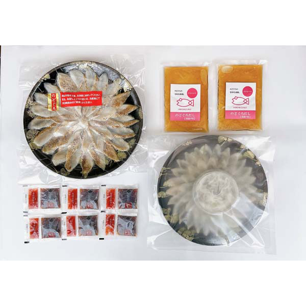 内容:トラフグ刺身50g、トラフグ皮刺し30g、のどぐろ炙り刺し120g、のどぐろだし(茶漬け用)100g×2、ポン酢14g×6、もみじおろし2.5g×6