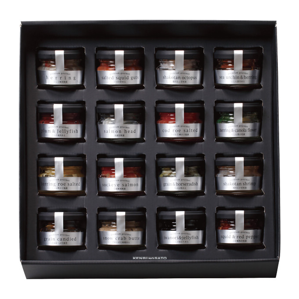 一品ごとに厳選素材を使用し、旨味を追求した贅沢な大人の逸品。見た目の美しさはもちろん、食べきりサイズの小瓶が16種類。お酒の肴やご飯のお友としても喜ばれる生珍味。
