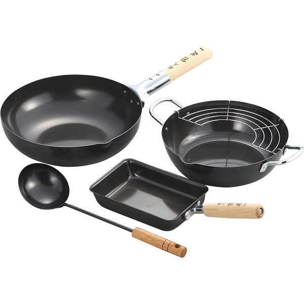 内容:北京鍋28cm=深さ約7.5cm)天ぷら鍋=容量約2.5l(深さ約6.9cm)、玉子焼=焼面サイズ約16×12cm(深さ約3cm)、お玉付ガスコンロ可、100・200V電磁調理器対応