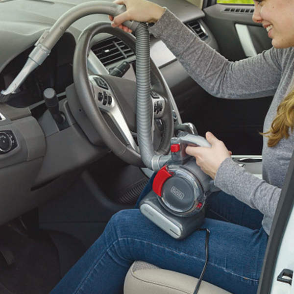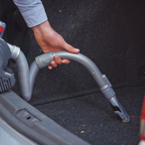 伸縮するフレックスホースが付いたカークリーナー。シートの隙間や足元もホースを伸ばしてラクラクお掃除できます。シガーソケット電源なので、安定した吸引力で収納に便利なメッシュポーチ付き。