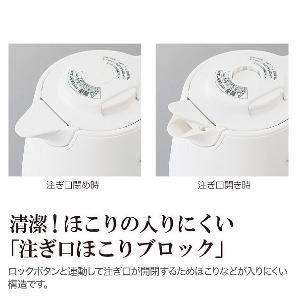 ●倒れてもお湯がこぼれにくい「転倒湯もれ防止構造」●清潔!ほこりの入りにくい「注ぎ口ほこりブロック」●必要な分だけすぐに沸く「ハイパワー1300W」●スムーズに開けられるから、給水もお手入れもらくらく「軽くはずせるふた」●ひと目でお湯の量を確認できる「見やすい水量窓」●持ちやすい形状のハンドル●流線がなめらかで注ぎやすい「なめらか注ぎ口」