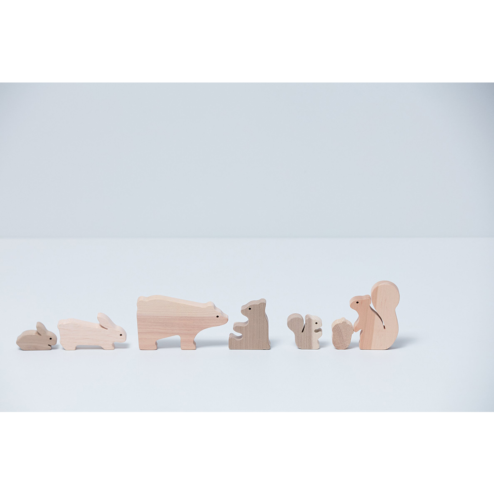 対象年齢:3歳~。さくら、くり、かばなどの日本の木々でつくった、日本の森に住むどうぶつたちの積木です。無塗装の天然木の心地よさや森の動物たちとの遊びをお楽しみいただけます。絵本作家・スギヤマカナヨさんデザイン。