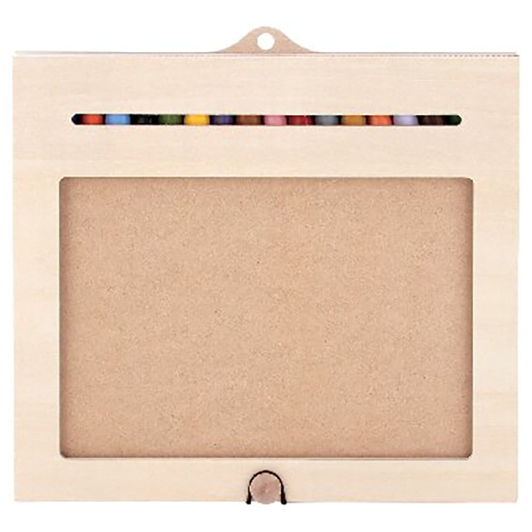 対象年齢:3歳~。用紙はA4コピー紙を30枚ほど入れられます。絵を描いた後に画板のふたを閉じれば画板が額縁に変身します。上面には壁に画板を掛けられるフック穴があります。細かいパーツがございますので、小さなお子様には十分にご注意ください。