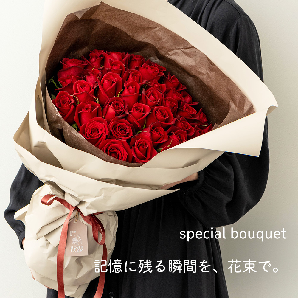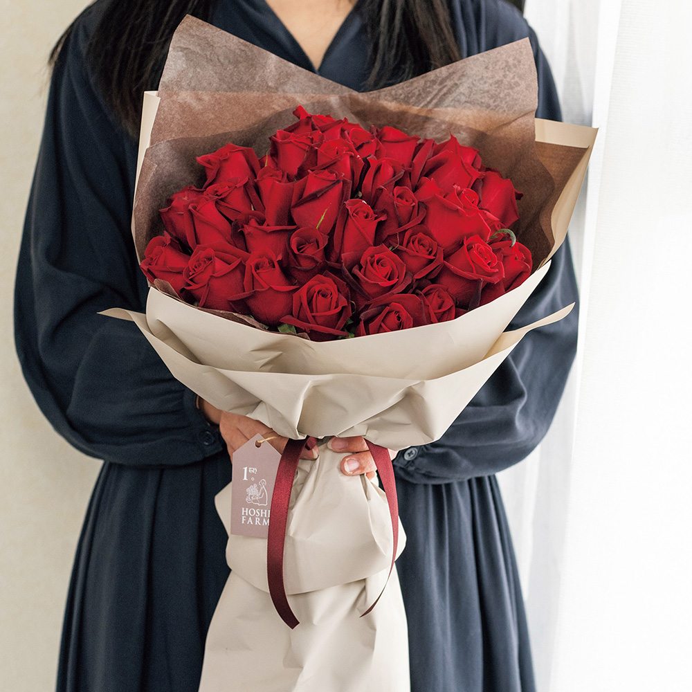 赤いバラの花言葉は「愛情」「美」「情熱」「ロマンス」「I love you」などホシファームの赤バラは「サムライ」の1品種にこだわっています。艶やかなベルベットのような深紅の花色と華麗な花形の大輪花が、エレガントで美しい格調高いバラです。花保ちがよいのも魅力のひとつです。40本のバラの花言葉は「真実の愛を誓います」など。大切な記念日に、想いをのせて贈りたい憧れのブーケです。プロポーズ、結婚祝、結婚記念日のほかに、歳祝、新生活祝など人生の節目を彩る豪華なギフトフラワーとしておすすめです。