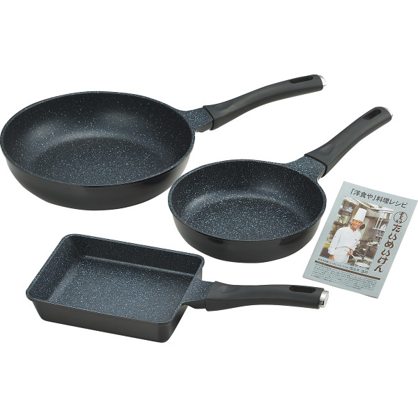 内容:フライパン20cm=深さ約4.7cm、フライパン26cm=深さ約5.7cm、玉子焼=深さ約3.2cm・焼き面サイズ約15×16cmミニレシピ付ガスコンロ可、100・200V電磁調理器対応