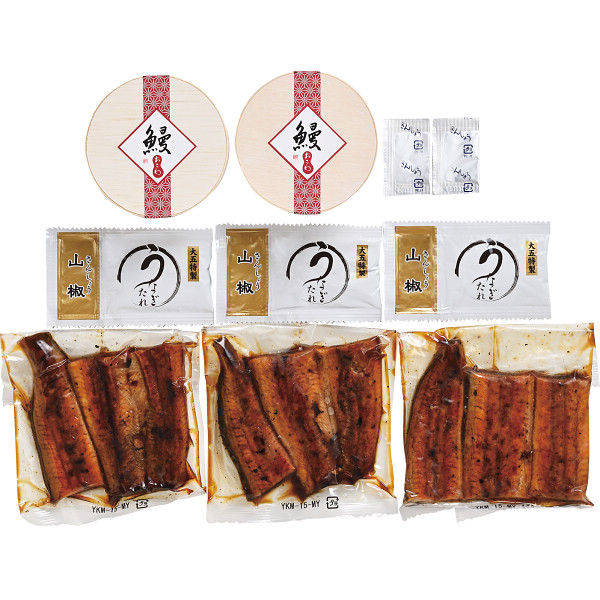 内容:蒲焼×3(計240g・真空個包装・うなぎ:宮崎県産または静岡県産)、山椒付きタレ15ml×3、うなぎおこわ(国産うなぎ使用)110g×2、山椒×2※山椒付タレのパッケージデザインは変更になる場合がございます。予めご了承ください。