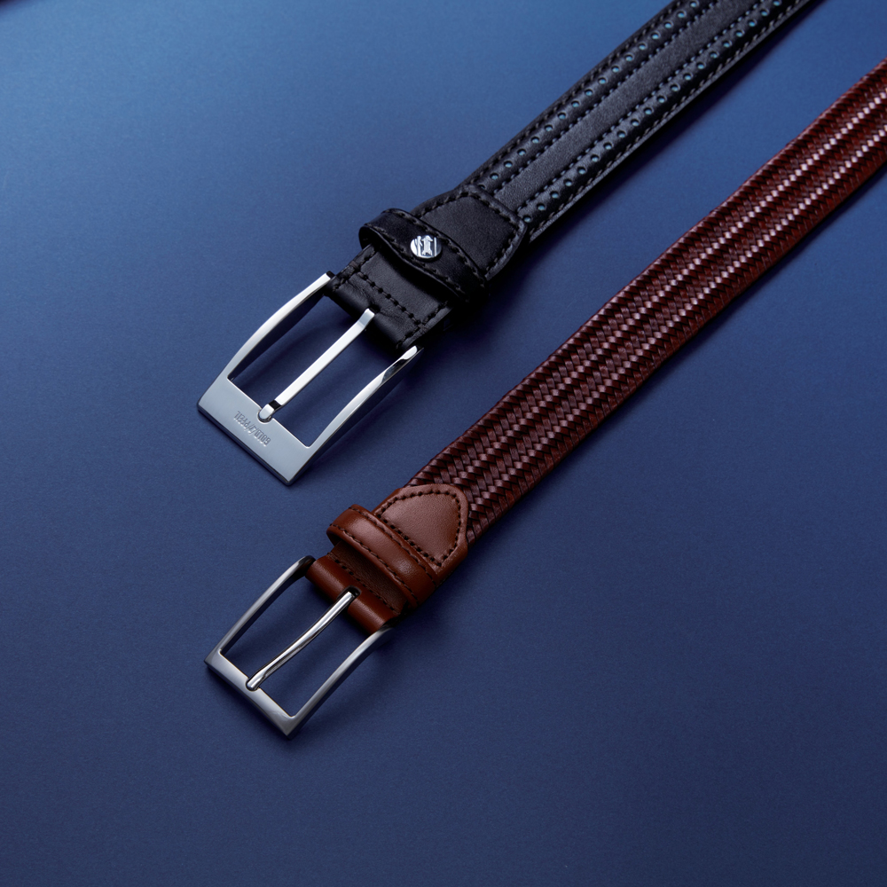 ピン式、長さ調節不可。ドイツ製の再生皮革を使用し、革ですが伸縮するベルトです。