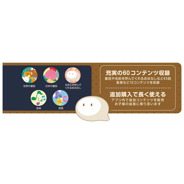 パパやママそっくりなコエでたくさんのおはなしを読んでくれます。最初に専用アプリで声を登録するだけで、そっくりな合成ボイス(=コエ)が生成されます。たっぷり60コンテンツ収録。アプリ内で追加コンテンツの購入もできます。やさしいBGMと聞きなれたパパやママのコエが、お子様を安心させます。視覚に頼らず、耳で聞いて想像するため、お子様の聴く力・創造力を養います。手に馴染みやすい丸みのあるフォルムと柔らかな明かりは、お子様のおやすみ時間にもピッタリです。
