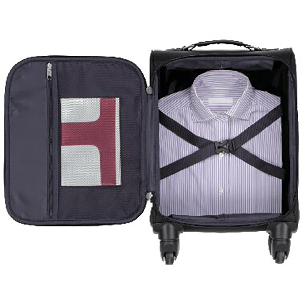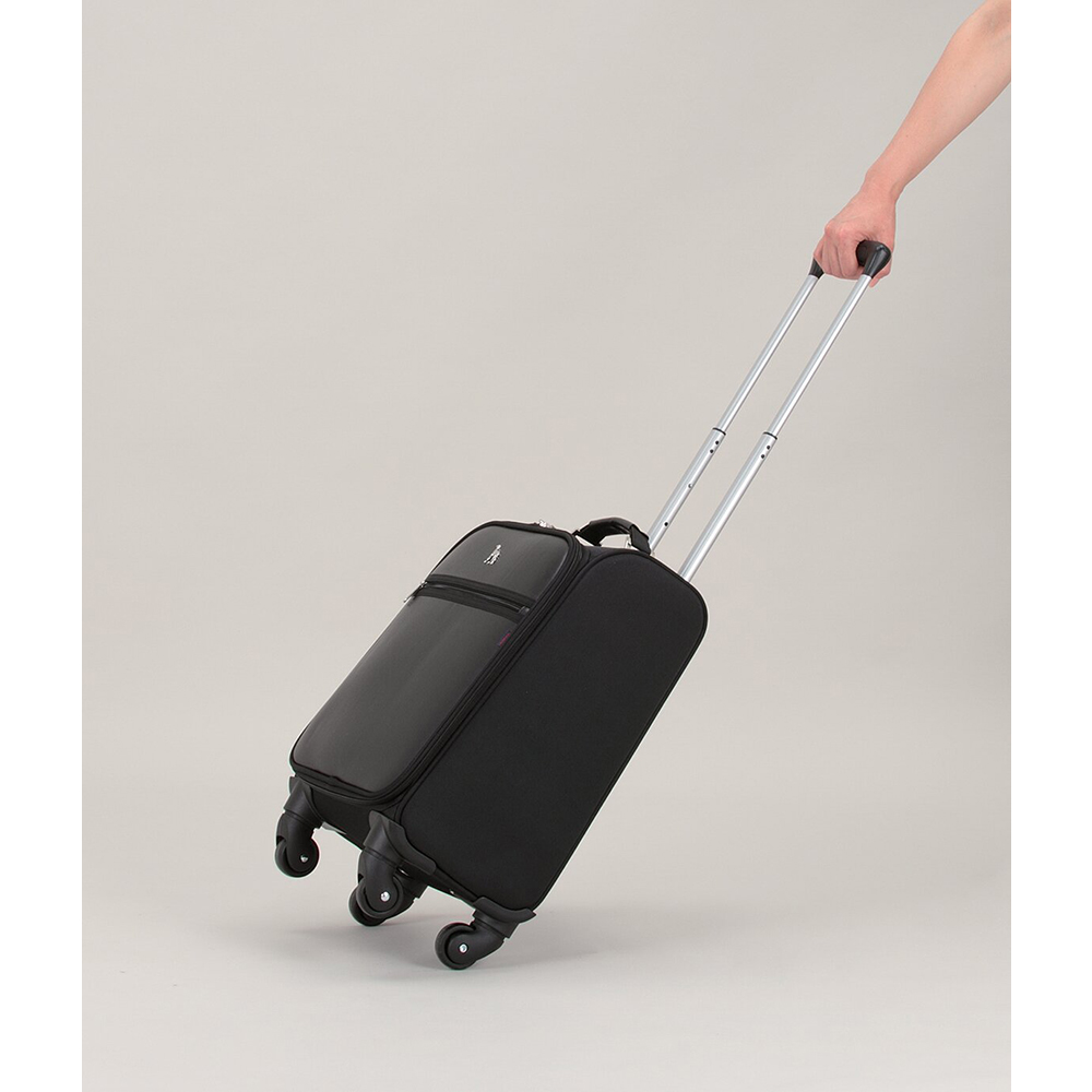 4輪キャスター式。開口部:ファスナー式、外部:ファスナーポケット1、内部:メッシュファスナーポケット1、南京錠付、伸縮式ハンドル(4段階調節)。