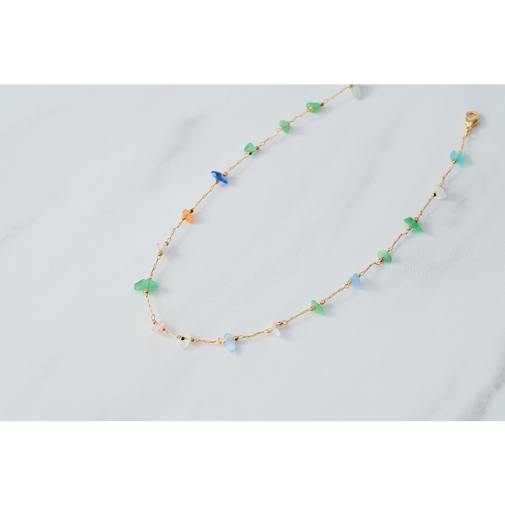 ちいさなガラスが散りばめられたショートネックレスです。カラフルな色合いが、コーディネートのアクセントにぴったりです。商品ごとにサイズ、形状、色味、並びに個体差があります。