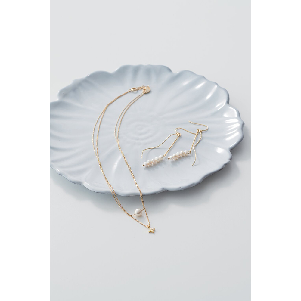 商品材料:トップ:錫合金(金色メッキ)・ガラス、人工パール(貝パール約6mm玉)、チェーン:真鍮(金色メッキ)